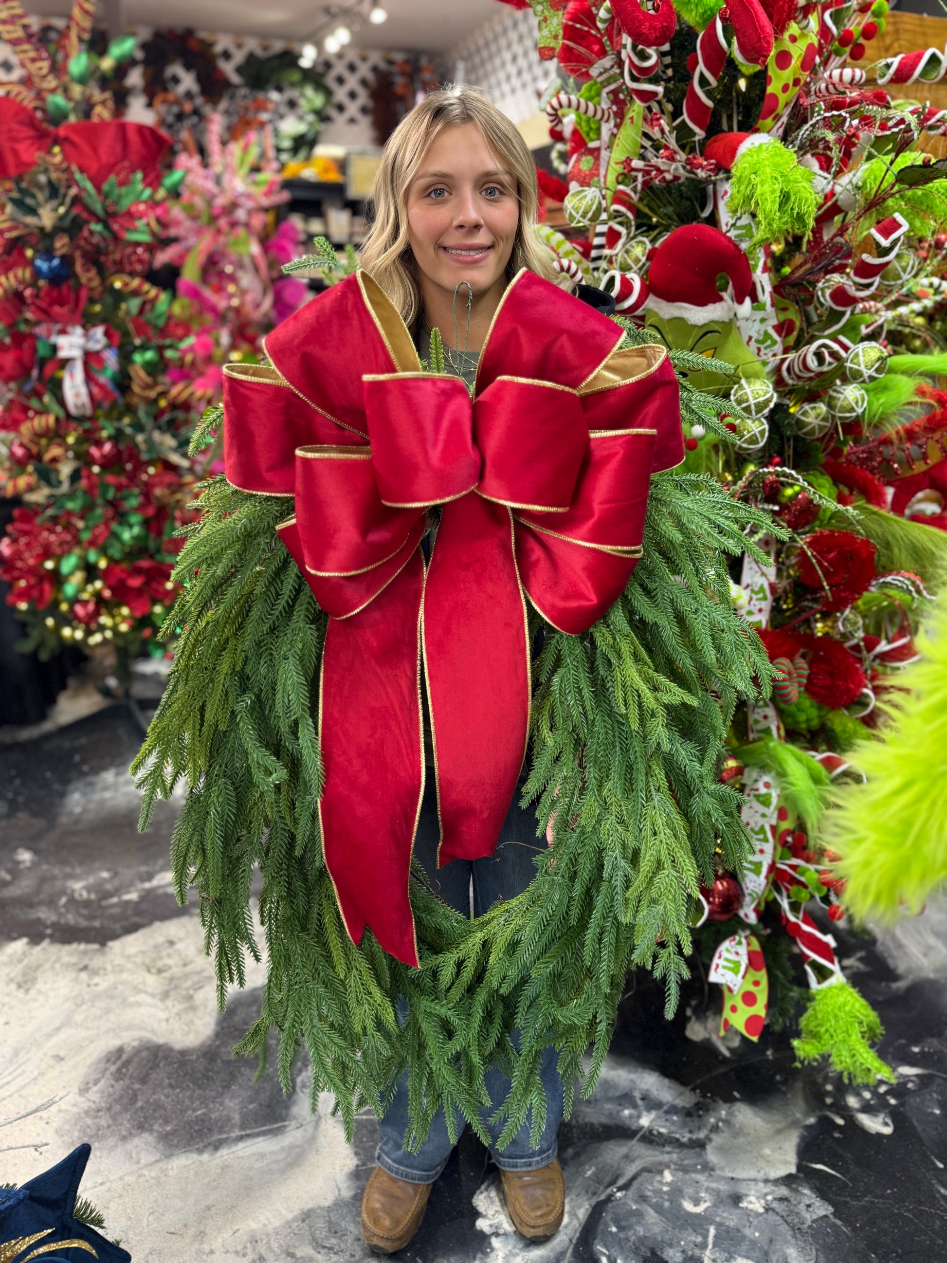 Handmade Faux Norfolk Pine Wreath with Lux Velvet Ribbon